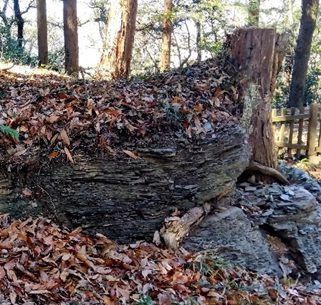 田黒の小倉城跡からまわってみよう。この城跡にはいたるところに石垣や石積みが見られる。使われているのは「青い石」、緑泥片岩である。埼玉県や比企地域にはこの青い石を使った板碑があちこちにみられる。小倉城と遠山集落の間には槻川が流れているがすぐ上流に青い石の産地である割谷採掘遺跡(下里・青山板碑石材採掘遺跡群)がある。こちらにも足を伸ばしてみたい。