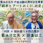 本イベントは、埼玉県比企郡小川町在住の絵本作家 菊池日出夫氏の作家活動45周年を記念し、菊池氏の作家デビューのきっかけを作った著名な絵本作家である田島征三氏を招いて、対談などを行うものです。主に3月20日に行う「対談・読み語り」および「サイン会・絵本即売会」と、3月20日を挟んだ3月中の日程で行う「図書館ギャラリー 絵本原画展」、「たゆたふ 作品展/絵本・シルクスクリーン・グッズ販売」の4つの催しを並行的に行います。